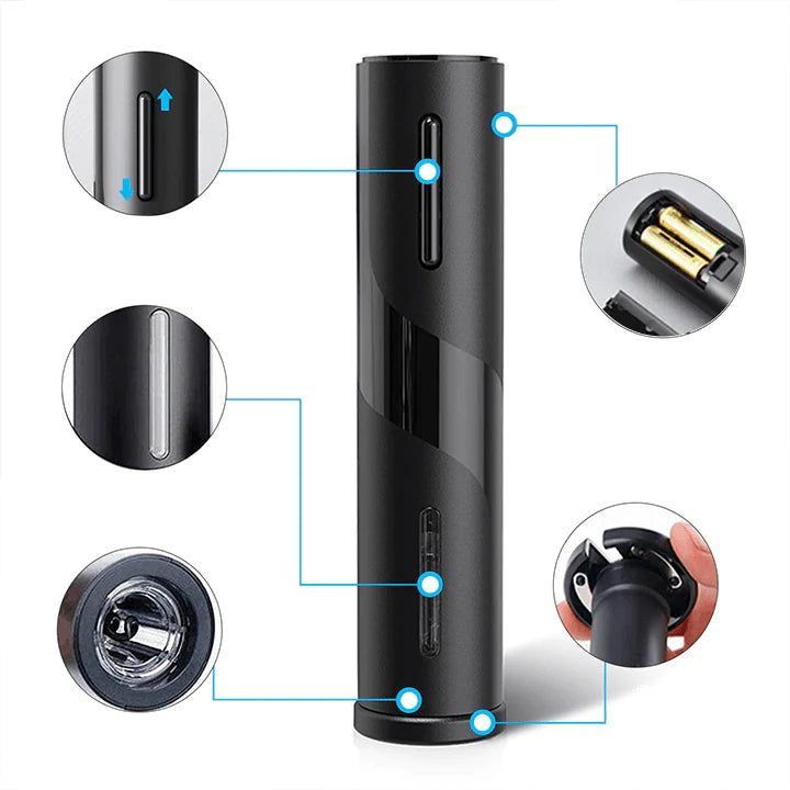 Nosso abridor elétrico permite a abertura do seu vinho com um simples toque levando classe e modernidade ao seu momento, e principalmente eliminando perigos como o de se sujar, quebrar a rolha ou até mesmo fazer aquela bagunça no ambiente.